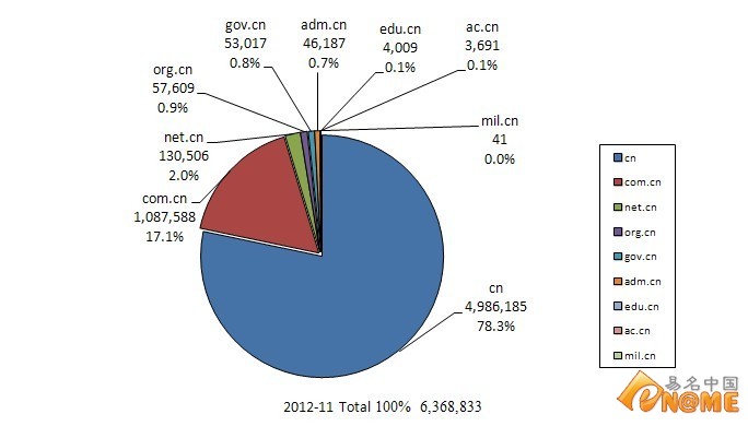 正如.CN域名餅狀分布圖所示,.cn域名注冊總量達4986185個,所占比例為78.3%,同比上個月78.2%的比例,本月下降了0.1%。.com.cn域名注冊量為1087588個,占17.1%的比例,同比10月份的17.2%,也下降了0.1%。第三大比例系.net.cn域名注冊總量達130506個,占了2.0%。