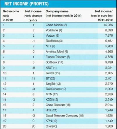 事實上,全球運營商整體的利潤情況并不是太好,遠(yuǎn)遠(yuǎn)不如中國三大運營商的情況。數(shù)據(jù)顯示,100強的凈利潤為1011億歐元,比去年減少了270億。而且,目前還有13家處于虧損狀態(tài),另有8家公司未顯示贏利情況。