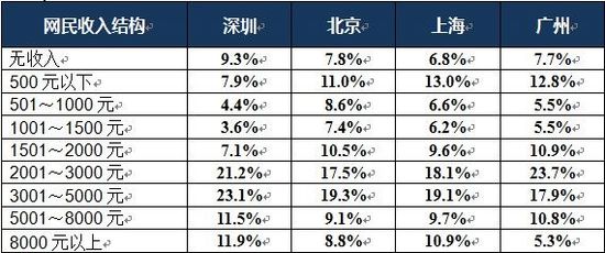《報(bào)告》顯示,和其他城市比較,深圳網(wǎng)民中學(xué)生比例相對(duì)較少,只有15.3%;而企業(yè)員工、專業(yè)技術(shù)人員、產(chǎn)業(yè)服務(wù)業(yè)工人占比偏多。網(wǎng)民月收入水平相對(duì)較高。在對(duì)北京、上海、廣州、深圳4城網(wǎng)民收入調(diào)查中,深圳網(wǎng)民不單年輕,而且“多金”,以月收入2000-5000元的居多(見(jiàn)附表),正是熱衷網(wǎng)購(gòu)且購(gòu)買力最強(qiáng)的消費(fèi)人群。