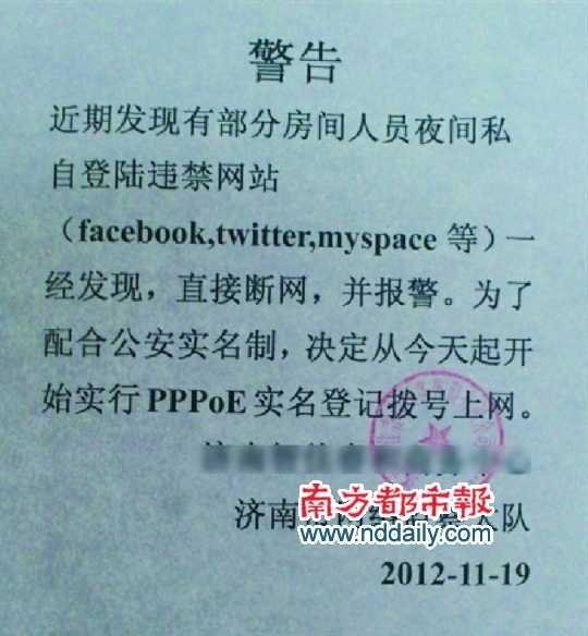 中國(guó)IDC評(píng)述網(wǎng)11月22日?qǐng)?bào)道:昨日18時(shí),一位名叫“Keso”的網(wǎng)友在騰訊微博發(fā)布圖文微博。圖片內(nèi)容是一份“警告”,落款為“濟(jì)南市網(wǎng)絡(luò)監(jiān)察大隊(duì)”,稱(chēng)“近期發(fā)現(xiàn)有部分夜間人員私自登陸違禁網(wǎng)站(facebook,twitter,myspace等)一經(jīng)發(fā)現(xiàn)直接斷網(wǎng),并報(bào)警。為了配合公安實(shí)名制,決定從今天起開(kāi)始實(shí)行PPPoE實(shí)名登記撥號(hào)上網(wǎng)”。昨晚,濟(jì)南市公安局網(wǎng)絡(luò)警察支隊(duì)向南方都市報(bào)記者辟謠稱(chēng),上述“警告”并非警方所發(fā)。